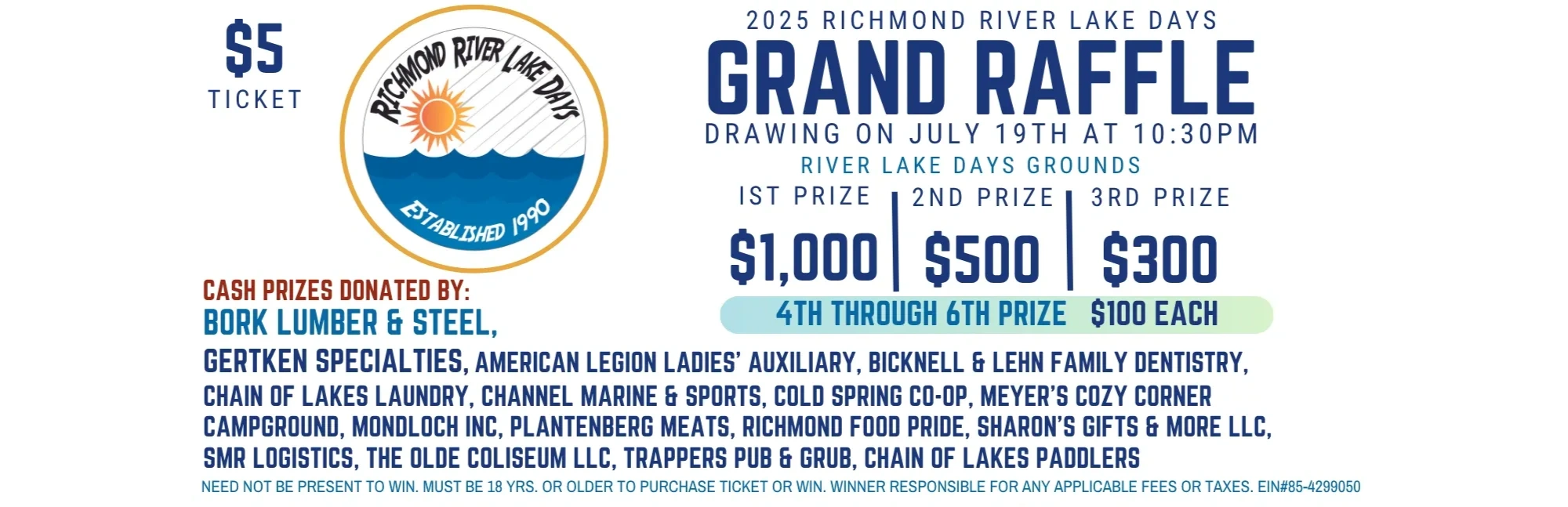 Raffle Tickets being sold at Richmond Food Pride, Sharon's Gifts & More, and Main Street General or your RLD Board members who can be contacted via Facebook or Email RichmondRiverLakeDays@gmail.com